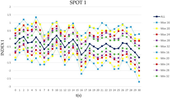 The graph represents the trend of ‘v’, the mean value of Index1 computed over the entire population (36 subjects) during SPOT1 (ALL). The dashed lines show the trend of the maximum and minimum values (Max, Min) of the index among the ‘v630’ for each second, in each subgroup of subjects (32, 28, 24, 20, 16).