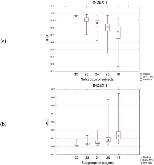 Concerning Index1, EEG frontal desynchronization, the correlation analysis showed that ‘v630’ significantly correlated with the vector ‘v’, associated with the entire population, considering the subgroups of 32 and 28 subjects. Reducing the sample size to 24, to 20, and to 16, two correlations over 630, 33 over 630, and 151 over 630 resulted as respectively not significant (p > 8 × 10−5). The Friedman test evidenced a significant decreasing effect of the mean rho values depending on the sub-groups, Figure 2a (Friedman chi-squared = 1868, p-value < 2.2 × 10−16). The post-hoc analysis showed that rho significantly decreased from 32 to 16 subjects, assuming different values for each subgroup (p < 0.05).