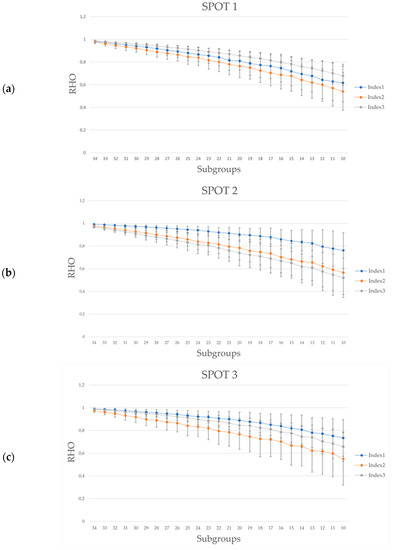 In conclusion, the average value of the Rho correlation coefficient between ‘v630’ and ‘v’ vectors, and its standard deviation among all the 630 combinations, were computed for all the possible sample sizes, from 34 up to 10 (generally considered as the minimum acceptable sample size) in order to model the function of the relationship between the correlation with the whole “Reference population (36 subjects) index” and the indexes resulting from reducing the sample size. Represented below (Figure 3) is the graphical representation of such a function for each spot for each index.