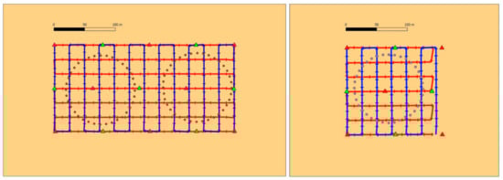 The surveyed area (orange background) with the trajectories of the three strip types: Longitudinal (blue); Cross (red); POI (brown). The figure depicts a Control type GCP with Enhanced control tightness (see Table 3) where GCP are represented by triangles. Different colours of triangles refer to control tightness: Basic (red) or Enhanced (red + green). (Left): LCO block configuration. (Right): HLCO block configuration.