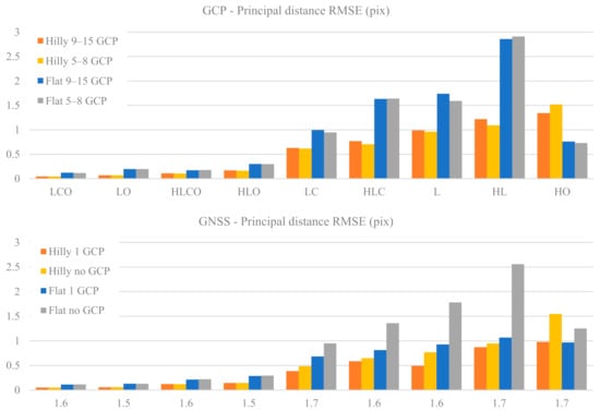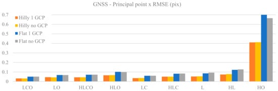 Overall, as far as the estimation accuracy of the IO parameters is concerned, the GNSS and the GCP cases show similar trends with respect to block configuration, terrain type and block control. Accurate estimation of the principal distance (see Figure 3) is ensured if POI oblique images are included to complement nadir-imaging longitudinal (and possibly cross) strips; if they are missing, the accuracy becomes two-to-five times worse. The HL case in flat terrain is particularly critical for both the GNSS and GCP case (up to ten times worse than the best case). It should also be noted that [10] in a single POI block (HO case) the accuracy is five times worse than the best case. Cross strips, on the other hand, provide only a marginal improvement. Although, at first thought, this might seem surprising, the image block being much more rigid with cross-strips, it is actually in line with findings from [10,18] where cross strips attained less than expected improvements or worse results. It should be noted, as far as principal distance is concerned, that nadir-imaging cross strips do not introduce significant new geometrical constraints (from a projective point of view) for its estimation. On the contrary, having a more significant depth change in the scene pictured by the oblique images (as well as due to the object geometry e.g., as in the hilly study area), drastically increases the accuracy of the estimation.