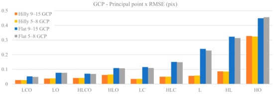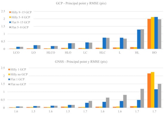 Figure 4 and Figure 5 represent the RMSE in pixels of the Principal Point (PP) coordinates PPx and PPy as a function of the nine block configurations, of the terrain type (Flat, Hilly) and of the control tightness (Basic or Enhanced).
