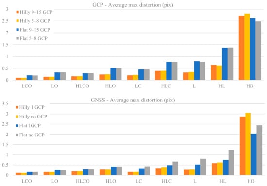 The average and standard deviation of the maximum residual distortion affecting the image coordinates after camera calibration parameter estimation (see Figure 6) show trends quite similar to those of PP accuracy estimation. It is worth pointing out that, in this analysis, the distortion error considers both the effects due to a not accurate estimation of the radial and tangential calibration parameters and the ones induced by a not accurate Principal Distance and Principal Point estimation. In other words, the reported errors represent the image coordinates error on image plane due to all the estimated parameters. It is therefore intuitive that this analysis shows similar trends of the ones in Figure 4 and Figure 5. The HO case is a stunning exception in the GNSS case as, even in hilly terrain, the accuracy is more than ten times worse than the best case. This is also true for the maximum average distortion, where HO shows a clear gap compared to other configurations.