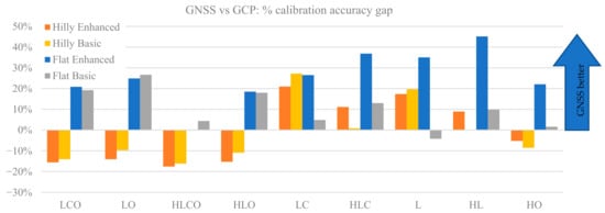 It is apparent that in hilly terrain both control types are basically equivalent, as differences are below 5%. Likewise, block control tightness is not very important as differences between Basic and Enhanced are also below 5%. In flat terrain with oblique images GCP performs better; however, just slightly so, with differences ranging from almost insignificant (LO, less than 1%) to small (HLO, 13%). Without oblique images, GNSS pre-calibration is better, with improvements up to 30% for square blocks (HLC and HL) and a bit smaller (up to 19%) in rectangular shaped blocks (L and LC). Interestingly, also with Basic tightness (no GCP) the GNSS case seems to deliver better calibration parameters than GCP when flying over a flat terrain.