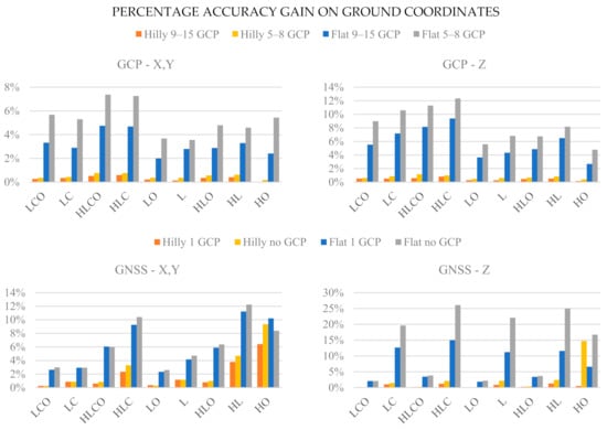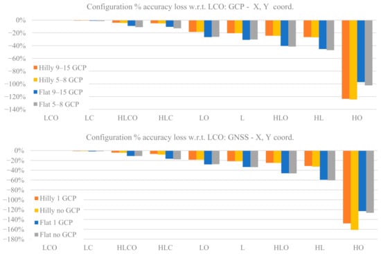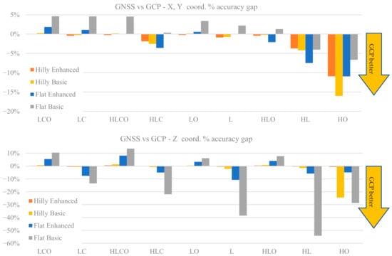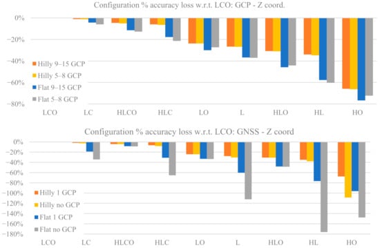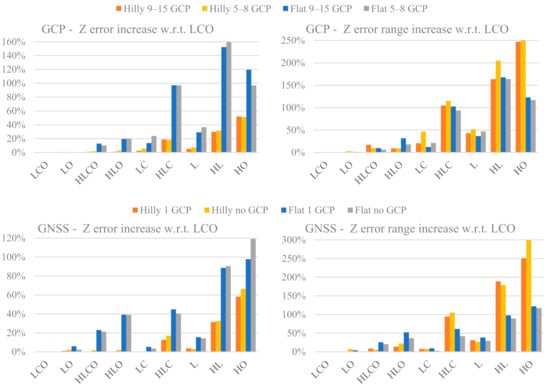 With the exception of HO case, the accuracy loss of horizontal coordinates as a function of the block configuration grows from just 1% (LC) to 30% (HL) in hilly terrain but reaches 60% (HL) in flat terrain. The double grid configurations show the lower loss (Figure 8). The pattern is similar for the GNSS and GCP cases, though in flat terrain the loss rate is more pronounced for the former.