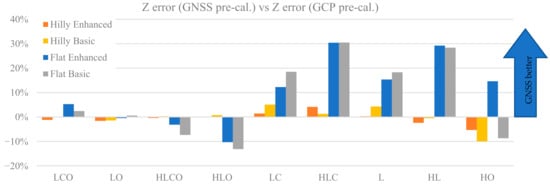Percentage Z error difference on check points for blocks pre-calibrated with camera parameter sets estimated with GNSS-determined camera stations or GCP. Percentages are shown as a function of the nine cases of the terrain type (Flat, Hilly) and of the control tightness (Basic or Enhanced). Positive values mark comparatively smaller Z errors for GNSS w.r.t GCP and vice versa for negative values.