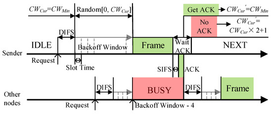 DCF in the WAVE standard is a distributed access algorithm using carrier sense multiple access with a collision avoid (CSMA/CA) mechanism in each node, which allows a node to obtain sending opportunities by contending channel. The contention process is shown in Figure 3. Before sending a frame, the node will detect the channel state and execute the backoff window after the channel has been idle for DIFS (DCF interframe space) time. The value of the backoff window is a random integer from [0, CWCur], where CWCur is the current CW value. The backoff window is equivalent to a timer, and data frames can only be sent when the value of the backoff window decreases to 0 in units of time slots. If the channel becomes busy before the backoff window is reduced to 0, it will lock the current value and continue execution when the channel is idle again.