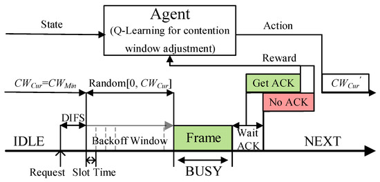 The reward function also determines the convergence speed and the degree of reinforcement learning. According to [12,13], when the agent receives an ACK message, it gains a positive reward, otherwise it receives a negative punishment of −1. At the same time, considering that a large CW value will cause a large transmission delay, the reward value is divided into [1, 6/7, 5/7, 4/7, 3/7, 2/7, 1/7] according to different CW. Using a smaller CW will receive a larger reward value after the transmission is successful; this makes the agent prefer the smallest CW that ensures successful message transmission. However, if the difference between the reward values is too significant, the agent will only focus on the delay sensitivity and ignore the impact of the ACK message. Instead of [1, 6/7, 5/7, 4/7, 3/7, 2/7, 1/7] in [12], the proposed reward function sets the reward values to [1, 0.95, 0.9, 0.85, 0.8, 0.75, 0.7] based on the experimental data, which can make the agent take into account the delay sensitivity and the transmission success ratio at the same time. Although ACK messages are only used in unicast in the WAVE standard, we extend the use of ACK messages for broadcast communications in Section 4.4 below.