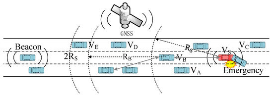 Vehicular ad hoc networks (VANETs) need to satisfy reliable communication requirements for intelligent transportation systems (ITS) and unmanned vehicles. The messages transmitted in the network are mainly service messages and security messages, which are respectively transmitted on the service channel (SCH) and the control channel (CCH). Security messages have higher requirements for low transmission delay and high communication reliability, bringing many challenges to VANETs [1]. Beacon messages and emergency messages transmitted by broadcast in VANETs are all security messages. Through periodic single-hop broadcast beacon messages, vehicles provide neighboring vehicles with their status information, such as location, speed, acceleration and deceleration, overtaking, and so on. When a traffic accident occurs, a vehicle involved in the accident needs to notify other vehicles in a more extended range through emergency messages by multi-hop broadcast to avoid risks in time.