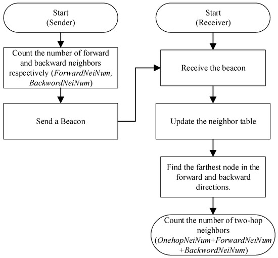 Figure 6 shows the process of calculating the number of two-hop neighbors. The sender periodically broadcasts beacon messages, which include the number of forward-neighbors and backward-neighbors of the sending node. Upon receiving a beacon message, the receiver updates its local neighbor table, which includes the number of forward and backward neighbors for each neighbor. The structure of the local neighbor table and its updating principle are described in the next subsection. We obtain the farthest neighbors in the forward and backward directions by looking up the neighbor table. Then we calculate the number of two-hop neighbors by adding the number of forward neighbors of its farthest forward neighbor (ForwardNeiNum), the number of backward neighbors of its farthest backward neighbor (BackwordNeiNum), and the number of its own one-hop neighbors (OnehopNeiNum). OnehopNeiNum is equal to the size of the neighbor table.