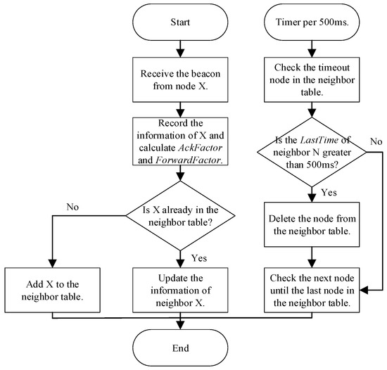 According to the neighbor table, one of the neighbors is selected as the response node to apply the ACK message to the broadcast communication scenario. The neighbor tables are maintained and updated using information from received beacon messages. Table 3 shows the structure of the neighbor table, where RSSI is the received signal strength indication, LastTime is the time when the beacon sent by that neighbor was last received, AckFactor is the metric used to select reply node for the beacon, and ForwardFactor is the metric used to select forwarding node in multi-hop broadcast communication. The neighbor table update process is shown in Figure 7.