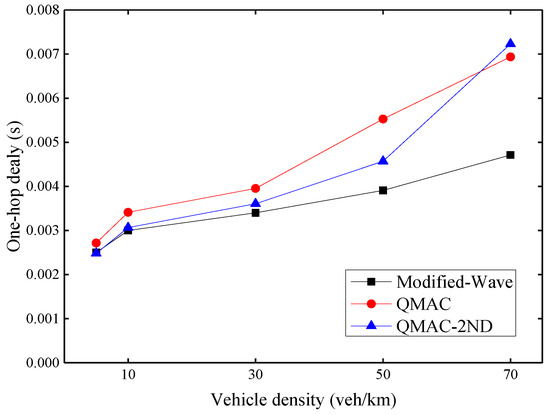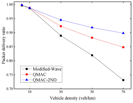 Figure 10 shows the average one-hop delay under different vehicle densities. As the density of vehicles increases, the one-hop delay increases for all three protocols. However, the delay increase trend of the modified-WAVE is slight. This is because the modified-WAVE cannot obtain a higher packet delivery ratio by quickly adjusting the CW value. It will reset the CW value to the minimum after each successful transmission. Therefore, although the modified-WAVE has the lowest delay, it is at the expense of a lower packet delivery ratio. QMAC can increase the packet delivery ratio by using a larger CW value, but the CW value cannot be adjusted quickly according to changes in vehicle density. It is possible that a large CW value is still maintained for some time after the vehicle density has reduced. Our proposed QMAC-2ND protocol can quickly respond to the changing vehicle density, and use the appropriate smallest CW value under the premise of ensuring the packet delivery ratio. When the vehicle density is 70 veh/km, QMAC-2ND has the largest one-hop delay because it sets a larger CW value according to the vehicle density to improve the packet transmission success rate. QMAC has a certain lag in dealing with changes in vehicle density, although its one-hop delay is relatively low, its improvement in packet delivery ratio is poor.