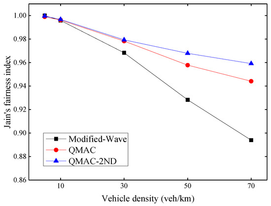 The fairness index is divided into long-term and short-term indexes. Since the communication of VANETs is mostly security-related messages, it is necessary to ensure that all nodes in the network have the opportunity to access the channel in a short time. Therefore, this paper focuses on short-term fairness, which uses the throughput of nodes per second for statistical calculations. Figure 11 shows Jain’s fairness index under different vehicle densities. As the density of vehicles increases, the fairness problem gradually becomes prominent. QMAC-2ND improves fairness by up to 6.5% compared with the modified-WAVE, and up to 1.5% compared with QMAC.