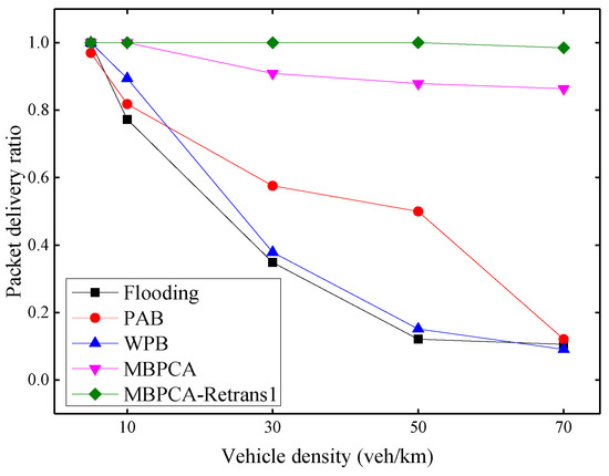 The packet delivery ratio under different vehicle densities is shown in Figure 12. With the increase of vehicle density, the average packet delivery ratio has a downward trend overall due to the increase in collision probability. When the vehicle density is 70 vehicles per kilometer, the packet delivery ratio of flooding, PAB and WPB drop to only about 1%. Both MBPCA without retransmission and MBPCA with one retransmission have better packet delivery ratios. Even when the vehicle density is 70 vehicles per kilometer, the packet delivery ratio of MBPCA can still reach approximately 86%. MBPCA with one retransmission maintains 100% packet delivery ratio when the vehicle density is 5, 10, 30, and 50 veh/km (vehicles/kilometer). Even when the vehicle density is 70 vehicles per kilometer, its packet delivery ratio still reaches about 98.5%.