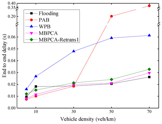 As shown in Figure 13, the average end-to-end delay increases as the density of vehicles increases. PAB has the worst delay when the vehicle density exceeds 50 veh/km. This is because its forwarding waiting delay is approximately exponentially related to distance. When there is no distant forwarding node or the packet forwarded by a distant forwarding node fails, this will cause a greater delay. WPB also has a high delay, because it has to wait a fixed time, for example, 4 ms, before each forwarding and retransmission. MBPCA has low latency, the longest delay is less than 30 ms, which meets the delay requirements of emergency messages. Although there is a 20 ms waiting time before retransmission, the average end-to-end delay of MBPCA with one retransmission increases very little because only very few packets need to be retransmitted. The flooding protocol performs best in terms of end-to-end delay when the vehicle density exceeds 50 veh/km, but it is at the expense of a packet delivery ratio.