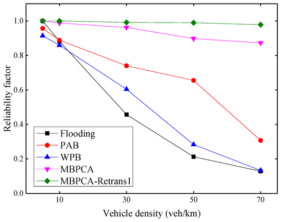 The reliability factor shown in Figure 14 is used to evaluate the receiving ratio of emergency messages of all nodes in the range of interest. Because the emergency messages not only must be notified to distant vehicles but also all vehicles within a specific region. With the increase of vehicle density, the reliability factors of the flooding, PAB, and WPB protocols decrease obviously. Because beacon messages are periodically transmitted in the network while transmitting emergency messages, an increase in the number of vehicles will increase the number of packets transmitted on the network, thereby increasing the collision probability. Although the reliability factor of MBPCA also shows a slight decrease, it can still maintain very high reliability. When the vehicle density is 70 veh/km, its reliability factor is still approximately 87%. Because we combine the MAC layer contention mechanism in the forwarding scheme, and assign a different backoff window to each candidate forwarding node as much as possible. The MBPCA with one retransmission can always maintain a reliability factor close to 100%.