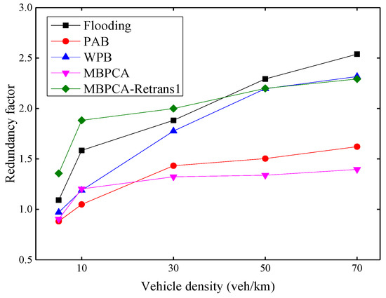 Figure 15 shows the redundancy factors of several protocols to evaluate the control effect of broadcast storms. The redundancy factor indicates the degree of message forwarding redundancy in multi-hop broadcasting, and a large redundancy factor may lead to a higher transmission collision probability. In general, the redundancy factor increases with increasing vehicle density. This is because more vehicles mean more forwarding nodes, which will increase the redundancy factor. Both MBPCA and PAB can maintain a low redundancy factor because a candidate forwarder will cancel its redundant forwarding after receiving the forwarding from the other neighbor nodes. MBPCA with one retransmission has a higher redundancy factor, but it can achieve nearly 100% packet delivery ratio and reliability factor. Therefore, we should only use retransmission for a few message types that require an extremely high delivery ratio and reliability in practical applications. In fact, the flooding broadcast will have a much higher redundancy factor than the simulation result if the forwarding collision of Emergency messages is not considered. Because forwarding collision not only reduces the reliability factor, but also reduces the number of redundant packets received by the node. Compared with flooding, WPB can reduce the redundancy factor, but the calculation of the node forwarding probability does not consider the vehicle density, so its improvement is limited. It should be noted that unlike the retransmission mechanism of our proposed MBPCA protocol, the retransmission mechanism of the WPB protocol only sets the forwarding probability to 1 when the forwarding of the neighbor node is not received; it does not forward the same message twice.