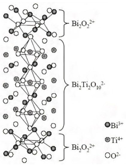 - Shulman, H.S.; Testorf, M.; Damjanovic, D.; Setter, N. Microstructure, Electrical Conductivity, and Piezoelectric Properties of Bismuth Titanate. J. Am. Ceram. Soc. 1996, 79, 3124–3128. [Google Scholar] [CrossRef]