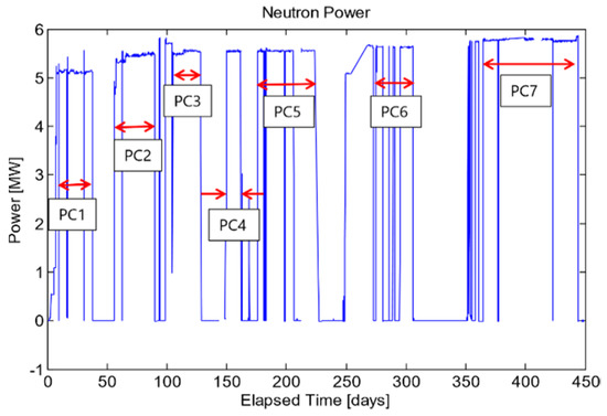 Plot of neutron power vs. elapsed time. PC# represents a full power cycle for which the neutron power remained relatively constant [14].