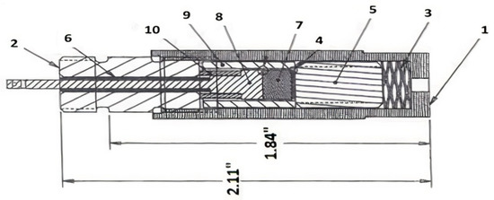 Sketch of the transducer capsule consisting of an outer casing (1), a cap (2), a high-temperature spring (3), the bismuth titanate wafer (4), the Kovar cylinder (5), the coaxial connection (6), the C/C backing material (7), the pressure plunger (8), and insulation (6,9,10). The bismuth titanate wafer was placed between the backing and the Kovar cylinder using foil [14].