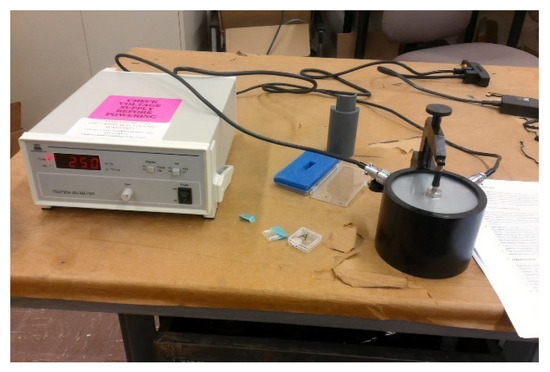To conduct acoustical measurements on these samples, a fixture was designed and fabricated from PVC, as shown in Figure 9. A female–male 50 Ω BNC adapter was screwed into the PVC. One of the nickel plungers, used during the construction of the piezoelectric sensors, was inserted into the female end of the BNC adapter and a BNC cable was attached to the other end of the adapter.