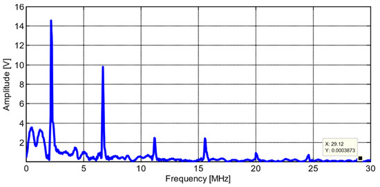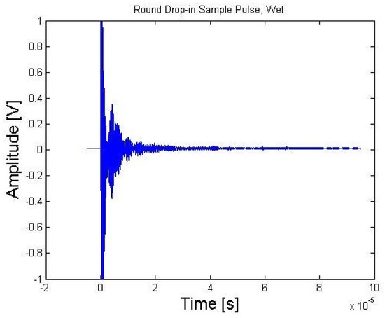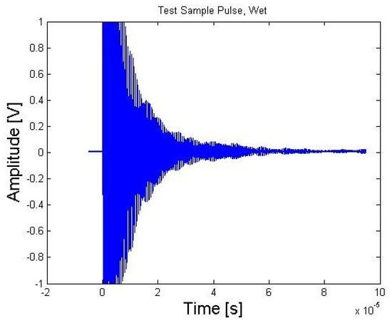 The first waveform was acquired directly after the transducer was inserted into the reactor, as shown in Figure 11. There was a significant ring down time from the main bang, taking between 10 and 15 µs to subside. Figure 12 shows the Fast Fourier Transform (FFT) of A-scan collected directly after insertion of bismuth titanate (BiTi) into the reactor [14].