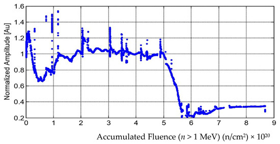 Bismuth titanate (BiTi) sensor pulse-echo amplitude of fundamental harmonic as a function of accumulated fluence. The spikes in amplitude occurred during periods where the reactor dropped to zero neutron power [14].