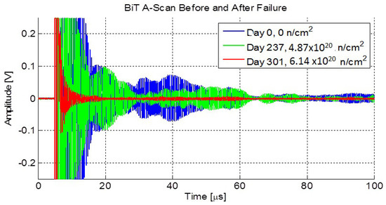 Comparison of A-scans (pulse-echo amplitude versus time) from days 1, 237, and 301 from the BiTi sensor. These represent A-scans from before and after the decline of the sensor [14].