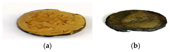 Bismuth titanate (BiTi) drop-in wafers. To the left in (a) is the pre-irradiated image and to the right in (b) is the post-irradiated bismuth titanate (BiTi) sample [14].