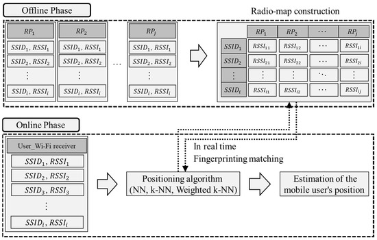Fingerprinting describes an indoor positioning technique that uses commonly available wireless area network technologies, such as wireless-fidelity (Wi-Fi), Bluetooth low-energy, and Zigbee [1,2,3] models. Numerous Wi-Fi fingerprinting studies have demonstrated improved transmission distances in indoor environments containing obstacles while supporting smartphone utilization. The fingerprinting process is normally divided into two phases: offline, which uses the Wi-Fi received signal strength indicator (RSSI), and online, which uses an established database to track the relevant positions in a real-time basis. In the offline phase, several reference points (RPs) are configured at normal intervals in the indoor area, generally divided into 2 or 3 m sectors that can be used to estimate a position based on the change of the measured RSSI [4,5,6]. Subsequently, Wi-Fi RSSI values for access points (APs) measured at all RPs are collected to build a radio-map database. Because the online phase attempts to estimate user positions based on similarities between the radio-map generated in the offline phase and the user’s RSSI values measured in real time, various probabilistic and deterministic algorithms can be utilized [6,7].