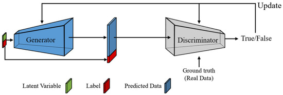 The generator’s training process comprises three steps, as follows. First, the generator receives a latent variable and a label as input to generate the predicted data. Second, the discriminator attempts to distinguish real from predicted data and determine their similarity. If the predicted data are sufficiently similar to the real ones, the discriminator yields “True” (T); otherwise, it yields “False” (F). “True” indicates that the generator’s data generation performance is higher than the discriminator’s classification performance, whereas “False” indicates the opposite. Lastly, the generator and discriminator are trained according to the classification performance of the discriminator. The loss functions of the generator and discriminator for training are extrapolated, respectively, as Equations (4) and (5):