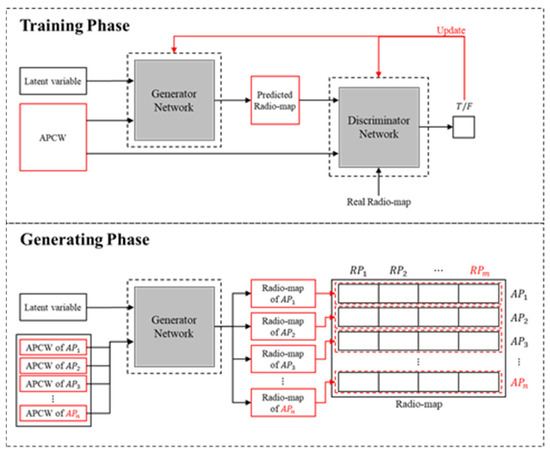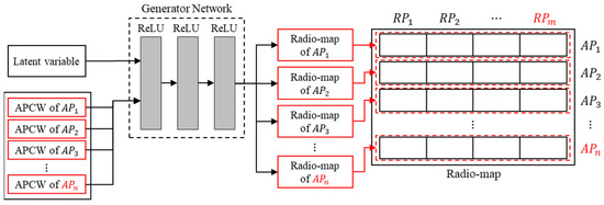 Finally, the generated radio-maps are combined to construe a single radio-map as shown Figure 8. In the figure, represents the number of APs, and represents the number of RPs. The output of generator is a value between zero and one. However, the unit of RSSI values measured in the online phase is in dBm units. Thus, the generator output is scaled via denormalization and input to the radio-map. The radio-map comprises a 2D matrix according to the AP and RP. Therefore, the predicted RSSI, which is a component of the predicted radio-map, is sequentially inserted by searching for the corresponding RP in the entire RP set. In other RPs, the minimum value of RSSI is inserted by assuming that the RSSI has a small value or that the location is not received. By repeating this process as many times as the number of APs, the entire radio-map of a 2D structure is constructed.