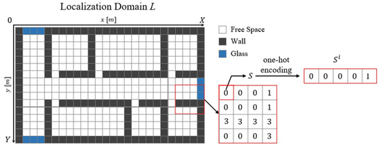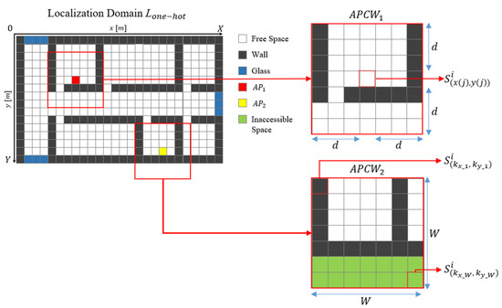 For RGN generation, it is necessary to reflect the physical environment (e.g., indoor layout and transmission distances) and the input structure of the label for training. To do this, we convert the indoor spaces into data to build the partitioned APCW centered around the AP. Figure 4 displays the localization domain after converting the entire floor plan into 2D data. Here, and axes denote spatial distances, and the localization domain, , comprises a set of cells that indicate certain spaces. Each cell is configured to a 1 × 1 m2 square in consideration of computing power and obstacle sizes that affect RSSI values within 3 m (a typical distance interval of Wi-Fi RPs). Accordingly, one cell is designed to contain spatial information of one space, and localization domain can be expressed by Equation (6):