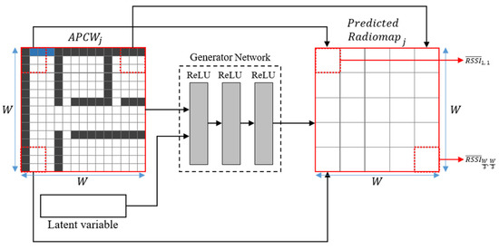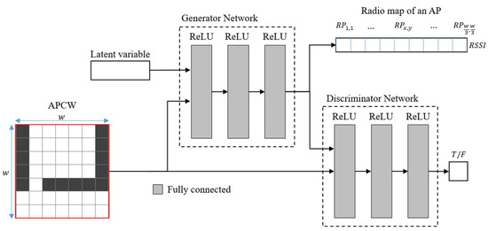 The input of the generator uses the latent variable, , and the APCW for learning the distribution of the real radio-map. The CGAN generator uses a static-size transposed convolution. However, this is implausible in this case, because the measurable distance of the RSSI values distorted by surrounding obstacles centered around all APs in is inconsistent. Accordingly, and the APCW are used as input to the three FC layers having rectified linear units (ReLUs) as activation functions [42]. During this process, the ReLU activation function addresses the vanishing gradient problem of the generator and discriminator, which comprise three layers apiece.