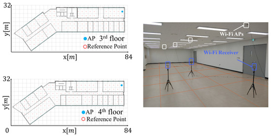 In this study, to verify the validity of the proposed APCW-based RGN, we trained and validated the network using RSSI data collected in a real environment. For data collection, RSSI was measured on the 3rd and 4th floors of the Korea Maritime University’s Mieum Campus (). Figure 9 illustrate structures of the experimental space for each floor, including AP and Wi-Fi receiver installations. The RP consists of 222 APs total. There were 112 on the 3rd floor and 110 in the 4th floor with a measuring interval of about 3 m.