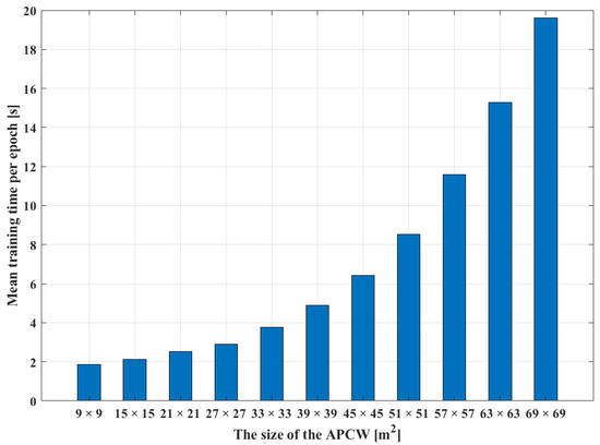In turn, the RGN’s radio-map generation accuracies according to APCW sizes were compared to derive the optimal partitioning distance. APCWs of different sizes were first generated at the same AP location. Subsequently, the generated APCWs were used as input to the RGN to compare the training times for each APCW size. Figure 10 illustrates the training times required per RGN epoch. The results were obtained by increasing the APCW size from to . In the figure, the X-axis represents the size of the APCW, and the Y-axis represents the associated training time per epoch. The sizes of the APCWs used as input of the RGN were configured as multiples of , because each cell of the radio-map generated from the RGN expressed an RSSI of . Hence, the size of APCW was set to . As shown in Figure 10, the training time of the RGN increased in proportion to the square of the APCW size. The training time increased significantly with the size of the collected database. Although both the RGN’s training time and the computational complexity decreased with smaller APCW size, the radio-map generation accuracy also decreased. Thus, it was necessary to consider both the RGN training time and radio-map generation accuracy when selecting the optimal APCW size.
