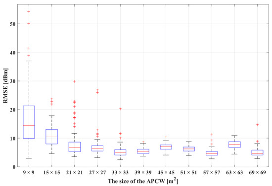Boxplot of the RMSE distribution between the real and RGN-generated AP radio-maps by different APCW sizes.