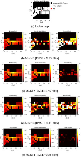 Figure 12 illustrates each model’s radio-maps generated by predicting the signals emitted from one AP. Figure 12a displays region maps to compare the generation accuracy of each model. In Figure 12a, red cells indicate the AP location; white cells indicate free space; and black cells indicate inaccessible space. Images in Figure 12b–e display the radio-map generation results obtained by Models 1, 2, 3, and 4. Models 1 and 2 generated sized radio-maps using a label that converted an entire building map into data, whereas Models 3 and 4 generated sized radio-maps. Hence, the size of the region-map used to compare the radio-map generation accuracy of each model was configured to , as with the output size of Models 3 and 4.