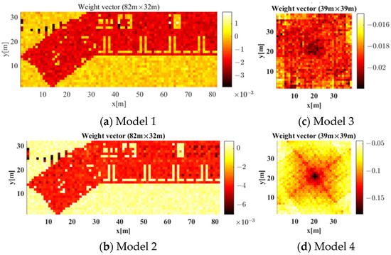 On the other hand, as shown in the results of Model 3 and 4 in Figure 13c,d, the weight vectors had the highest values at the center, which gradually decreased as the distance increased from the center. For signals, propagation phenomena (e.g., reflection and diffraction) occurred with obstacles, including walls, and the radio-map distribution changed, owing to the propagation phenomenon becoming smaller as the signal strength decreased. Accordingly, the radio-map distribution change became smaller with the increase of the distance between the AP and the obstacle.