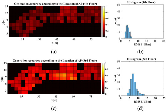 Figure 14b,d each show histograms of Figure 14a,c, respectively. A histogram expresses the size of components comprising the data and the frequency distribution of such sizes. Because there was difficulty checking results of individual cases, owing to the substantial number of APs and RPs in the experiments, histograms were used to statistically analyze the results. A smaller RMSE value indicates a higher radio-map generation accuracy. Thus, having a higher distribution on the left side of the RMSE histogram indicates higher radio-map generation accuracy. In the histogram, the X-axis represents the RMSE value between the predicted and real radio-maps, whereas the Y-axis represents the frequency of the values. As shown in the results of Figure 14a,b, the RGN generated an accurate radio-map regardless of the AP location on the 4th floor. This indicates that the RGN generated the radio-map after learning the structural patterns of the APCWs, which change per AP location and the radio-map distributions of the corresponding structures. For the results of Figure 14c,d, the RGN’s radio-map generation accuracy decreased on the 3rd floor compared with 4th floor when the AP was positioned at the center. This can be attributed to the structural difference at the center and the lower-left parts of the floors. Extant methods were limited to specific buildings used for training, but the proposed APCW-based RGN enables radio-map generation without measuring Wi-Fi signals, even when applied to new buildings. Thus, radio-maps were generated that learn all 3rd and 4th floor structures. Figure 15 displays the radio-map generation accuracy for the 3rd and 4th floors obtained using the RGN trained with data collected from 3rd and 4th floor dataset. where X and Y axes in the images of Figure 15a–d were the same as in the images of Figure 14a–d. As shown in Figure 15c,d, the RGN trained using data from both floors generated a more accurate radio-map compared with the RGN trained with data of only the 4th floor. This indicates that the APCW-based RGN learned patterns of new structures and generated a good radio-map.