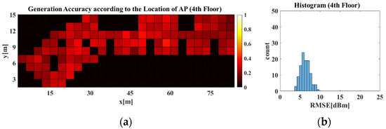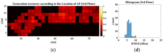 To analyze whether the RGN that learned the indoor structural patterns generated accurate radio-maps, an experiment was conducted to compare the RGN accuracy per AP location. Figure 14 displays radio-map generation accuracies obtained from different AP locations on the 3rd and 4th floors using the RGN trained with data collected from the 4th floor. In Figure 14a,c, RMSE values between the predicted radio-map generated by the RGN when the AP were located at arbitrary X and Y coordinates in , and the real radio-map of the corresponding AP location was displayed. Here, X and Y axes represent the coordinates of the AP location. Each cell shows the result of the RMSE of real vs. predicted RSSI in RPs according to the location of the AP, and the darker the color of each cell, the lower the error of predicted RSSI at the coordinates of the AP location.