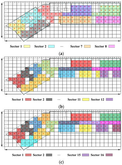 We divided the region map into sectors according to the number of APs to enable localization of all RPs. Figure 16 shows the sectors placed divided according to the number of APs in the region map of the localization experiment environment. We randomly selected one AP for each sector to compare and analyze localization performance. As for the experimental RSSI data, the RSSI data measured 200 times for each AP in RP were randomly sampled and converted to 250 for each RP, and the total number used in the experiment was 27,500.
