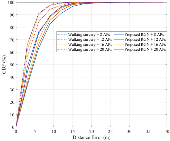Comparison of CDF positioning errors between the proposed RGN and walking survey for varying numbers of installed AP.