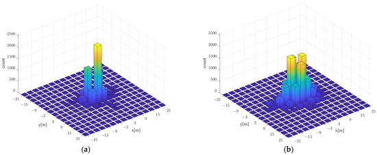 Figure 18 shows the error distribution of real and predicted locations using walking survey and proposed RGN-based localization. The x-axis and y-axis represent the error location of each axis, and the z-axis represents the frequency according to the error of each predicted location. In this experiment, localization was performed 27,500 times using the experimental data randomly sampled 250 times among the RSSI data measured 200 times per AP at 110 locations in the environment shown in Figure 15d. The distribution of localization errors based on the walking survey shows that the maximum frequency was 2550 at the point where the y-axis was 3 m apart, which is biased compared with other points. The distribution of the proposed RGN-based localization errors was the maximum frequency of 1967, which showed a balanced form according to the direction. The two approaches had significant differences in localization performance, but the radio-map generated using the proposed RGN only required information on the floor plan, and the radio-map constructed using the walking survey required RSSI of each AP collected with 200 repetitions per RP. In other words, by implicitly inferring radio-map using the proposed RGN, there was an advantage of reducing collection times and workloads.