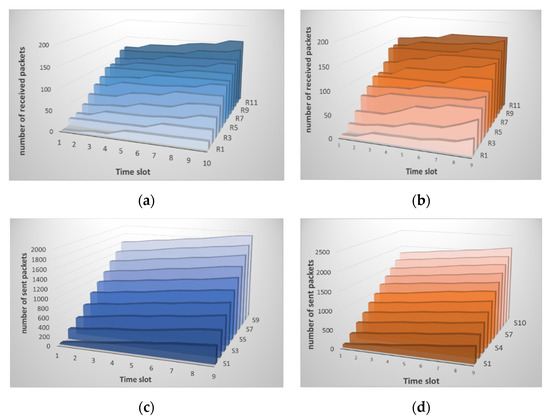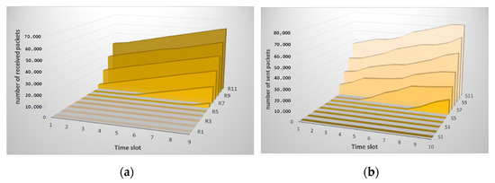 - Recording the normal operation of the sensor system, when the nodes exchange information according to a given algorithm using the User Datagram Protocol (UDP) [32], and when the Optimized Link State Routing (OLSR) protocol [33] is used between the nodes. In this case, there is no additional effect on the sensory system.