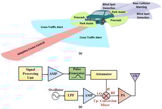 In recent studies, the demand for 5G communication systems was shown to have enormously increased. There are many 5G mobile communication devices available; some of them are wireless broadband internet, cellular phones, etc. Low power, low voltage and highly linear RF circuits attract considerable attention in regard to prolonging the battery life of communication systems. The 5G system is becoming a necessity in wireless communication [,]. Existing technologies, including LTE and 4G mobile communications, cannot satisfy the increasing demands for a fast data rate, low latency and larger capacity. The 5G system is 1000 times faster than 4G technology. Furthermore, 5G accumulates high data traffic capacity. Many advanced communication applications require a high capacity, high data rate communication system, and the 5G technologies fulfill these requirements. A frequency band from 20 GHz to 30 GHz has been relevant in 5G radar applications []. Vehicular Radar systems can give useful insight into the other millimeter-wave applications. Additionally, in the automotive sector, radars are widely employed for the development of cars, which offer the basis for a secure and intelligent transport system []. The 5G frequency spectrum gained a great deal of attention because of its prospective usage of automobile vehicles for radar applications []. Nowadays, automotive radar is regarded as one of 5G technology’s most important vertical markets. Thus, in [], the author also describes a 5G transceiver radar application (24 GHz) that achieves a high data rate and wide bandwidth. The radar applications in automobile vehicles and radar transmitter design are shown in Figure 1a,b, respectively.