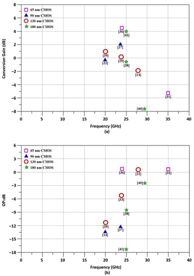 Literature survey of up-conversion mixers [,,,,,,,,,] with operating frequencies of 15–35 GHz. (a) Conversion gain, (b) OP1dB.