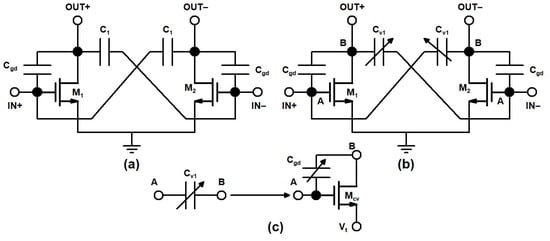 In the designed mixer, TCC-CS topology provides a high gain and stability, downgraded in CS topology due to parasitic gate to drain capacitances (Cgd) of transistor M1 and M2. The conventional capacitive neutralization proposed TCC-CS and the realization of a varactor in TCC-CS is shown in Figure 5a–c, respectively.