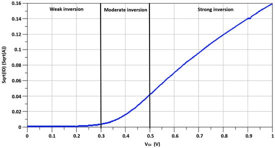 When it works in the saturation region, the operating region of the CMOS transistor is classified into three different regions: weak/moderate/strong inversion regions. The primary reason for non-linearity in the CMOS transistor is the transconductance (gm) []. In the weak-inversion region, the operational speed of the CMOS transistor is slow, but the ratio of gm and drain current (Id) is high, while it is reversed in the case of the strong-inversion region of the CMOS transistor. The moderate-inversion region exhibits good operational speed and a good gm/Id ratio. The drain to source current (Ids) of a CS transistor is shown in Equation (3) [].