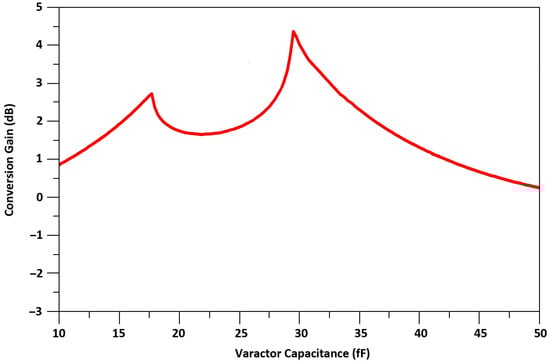 Equation (1) shows that when varactor’s capacitance Cv1 is equal to Cgd1, the stability factor is maximum. As we use a varactor’s capacitance, to neutralize the Cgd, which can be controlled externally, the PVT variations do not affect the stability of M1. The simulated varactor capacitance versus the voltage, Vt, is shown in Figure 10. The gain, G, of TCC-CS of the transconductance stage is expressed in Equation (2) and the calculated result of G versus the varator capacitance is shown in Figure 11.